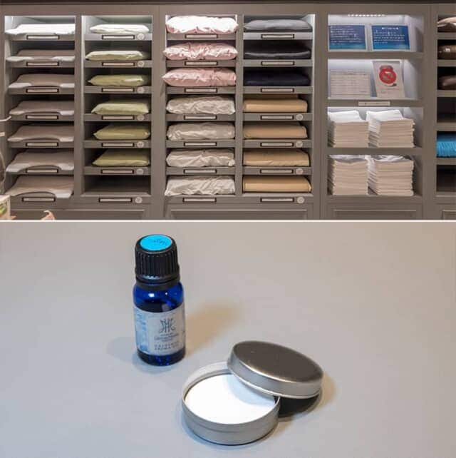 宿泊客は、厚さや柔らかさなど数種類用意された枕から好きなタイプ1つ選んで使えます(数量限定)。また10種類以上の香りから1つ選べるアロマは、枕元に置くのがおすすめです。ホテルオリジナルの香りを選びました。