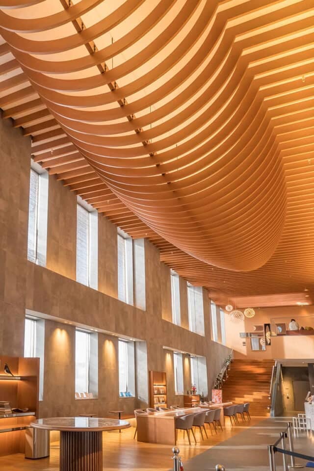 高い天井は、古くからの港町を象徴するように船底をモチーフにした装飾が存在感たっぷり。ゲストがくつろげるテーブルや椅子が置かれ、水の流れる水盤を設置するなど上質な雰囲気をたたえます
