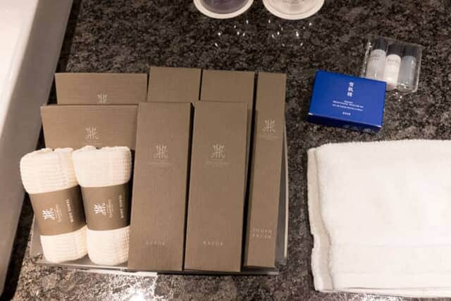 スイートルームのアメニティはボックスケースに入っていて上質感が高まります。スキンケア用品も男女共にありました。