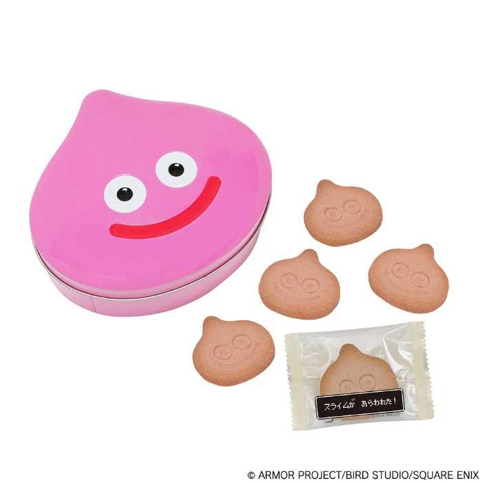新登場の「ドラゴンクエストスライムサブレピーチスライム<いちご風味>」は、ピンク色のピーチスライムがデザインされた缶に、スライム型サブレが16枚入っています。