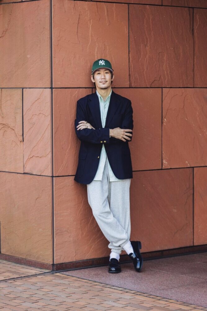 ベースボールキャップが魅力的な王道アメトラスタイルの唐澤さん。スウェットパンツは、ダボッとしすぎないシルエットと裾の溜まり具合が絶妙。アイテム選びにセンスを感じます。