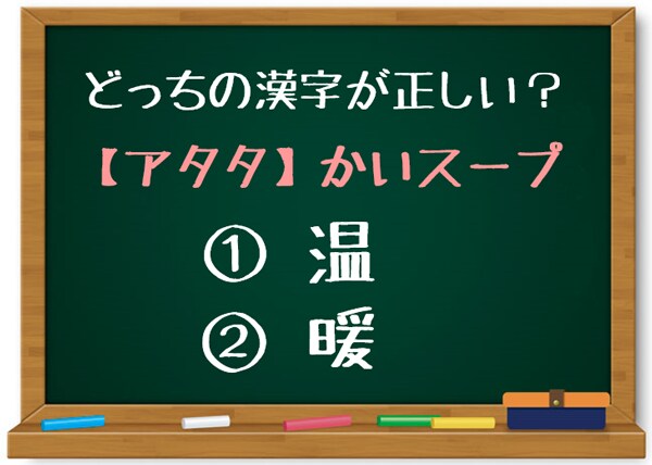 「<アタタ>かいスープ」のアタタに入る正しい漢字はどっちでしょう? 漢字自体はそんなに難しくないこの問題。でもいざとなると「あれ? どっちだっけ……。」と悩んでしまいますよね。ヒントは、この言葉をどんな時に使うを考えてみてください。