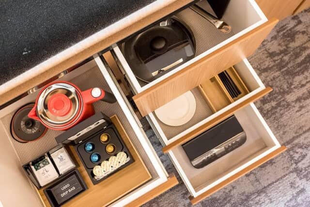 レジデンスフロアの客室にはコンパクトなシンクに加え、2ドアタイプの冷蔵庫や電子レンジもありました。