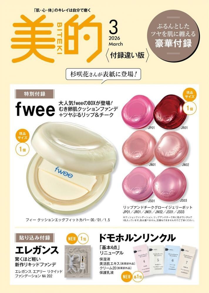 3月号は3つのバージョンがあり、特に注目度が高いのは「付録違い版」(1500円)です。韓国発のコスメブランド「fwee(フィー)」の現品サイズのコスメが2つ付いています。
