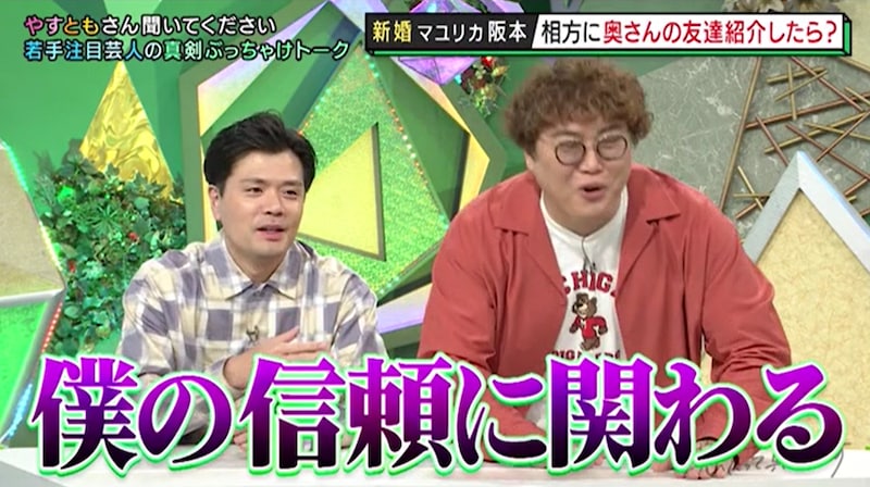一方の海原やすよ(海原やすよ ともこ)は、芸人仲間たちが次々と結婚している状況に触れて、「芸人さんの奥さんという、理解があるお友達も多くなっているんやったら、そこは繋がっていくんじゃない?」と中谷にアドバイス。「優しい人」であり「怒ったことがない」という、阪本の妻から友達を紹介してもらうように提案した。