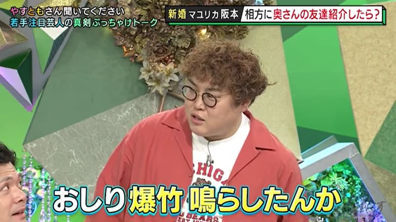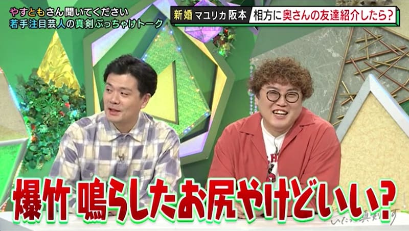 さらに阪本は、幼馴染である中谷の秘密を暴露! 「3年とかお付き合いしても、お尻を絶対見せないんですよ。お尻が汚すぎて」といきなり語る阪本に中谷は慌てて、「説明が足りてない!」とツッコんだ。中谷いわく、「当時お付き合いしていたときに僕お尻ホンマにブツブツまみれで、爆竹鳴らしたんかってくらい汚くて。付き合っている奴のお尻がこんなに爆竹鳴らしてるみたいなん嫌やろなって思って……」とのことだ。