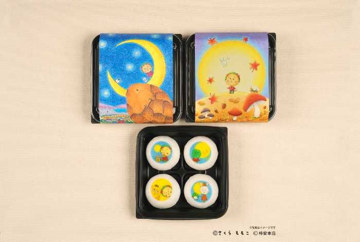第2弾となる今回は、月を背景にした原画イラスト掛け紙が2種類登場します。生地は山芋や米粉を用い、しっとりもっちり食感に仕上げたもの。