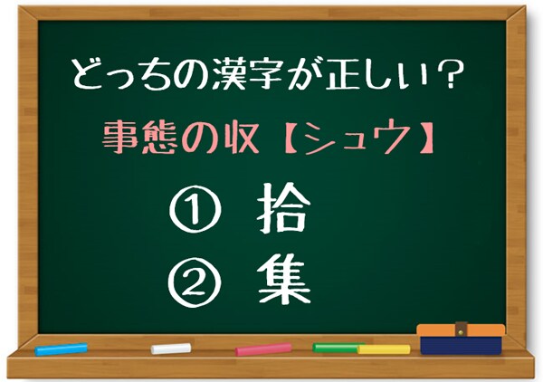 「事態の収<シュウ>」のシュウに入る正しい漢字はどっちでしょう? 漢字自体はそんなに難しくないこの問題。でもいざとなると「あれ? どっちだっけ……。」と悩んでしまいますよね。ヒントは、この言葉をどんな時に使うを考えてみてください。