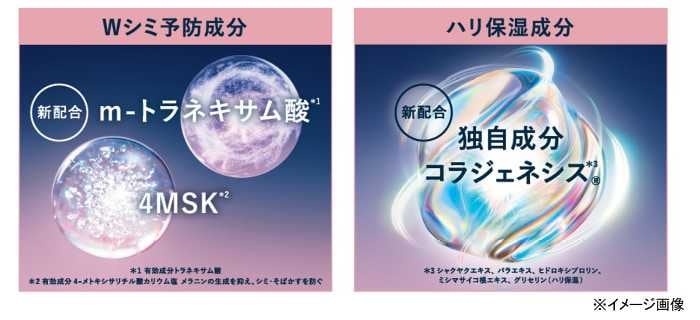 エリクシールの新ブライトニングシリーズは、シミを防ぐ2つの美白有効成分「m-トラネキサム酸※3」「4MSK※4」をダブル配合。