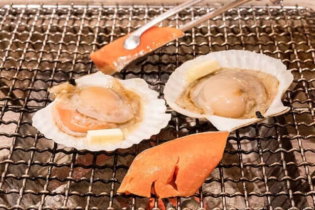 炉端レストランだけに焼物は欠かせません。季節の焼き魚や割り醤油をかけたホタテ、シシトウやトマトなどを備長炭であぶります。