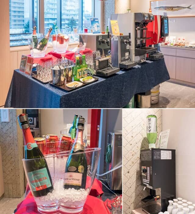 飲み物はレストランの一角にドリンクビュッフェを用意。コーヒーや紅茶にくわえ「函館牛乳」や「ヨーグルッペ」などのほか、さまざまなアルコールを飲めるのは驚きです。スパークリングワインはスペイン・バレンシアの白「ミケタ ブルット」とフランス・ブルゴーニュの「ヴーヴ デュ ヴェルネ ロゼ」。熱燗マシーンまでそろうのは嬉しすぎです。