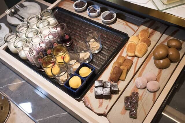 食事の最後にデザートワゴンも登場します。ビュッフェ朝食提供している大沼の牛乳を使ったプリンやチョコレートブラウニーのほか、日替わりのデザートなどもいただけます。さらに和菓子は “囲炉裏朝食” のみの提供です。