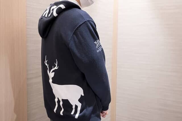 お店のスタッフはエゾシカの柄が印象に残るパーカー姿。北海道発のアパレルブランド「TNOC hokkaido(ティーノック北海道)」の服を制服に採用。TNOC hokkaidoの売上の一部は、自然を守る活動に寄付されていて、ホテルも自然保護に貢献しています。