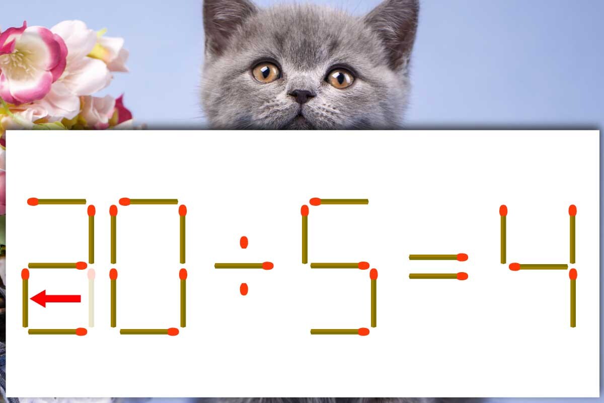 「3」の右下のマッチ棒を左にスライドさせて「2」を作り、「20÷5=4」にする。※解答は複数ある場合があります。