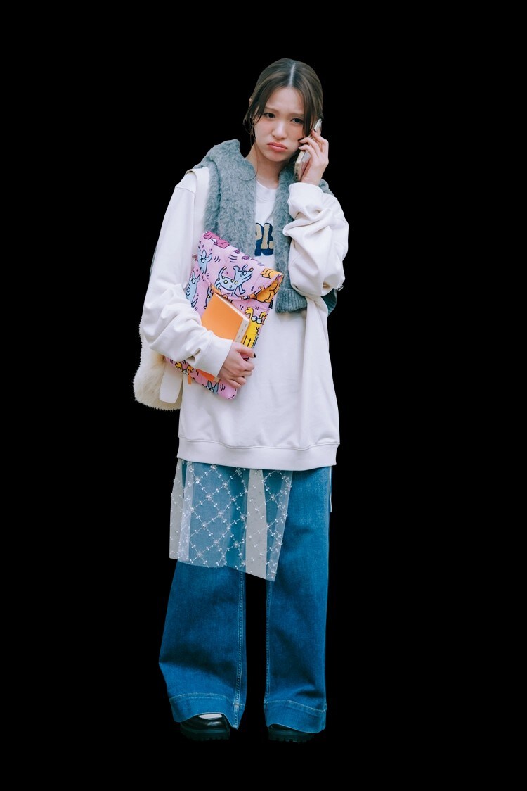 BIGロゴスエットは着回し。ニットカーディガン(ニットカーディガンとビスチエのセット)23,980円/LILY BROWN レースラップスカート 3,960円/Lumier フレアーデニムパンツ 3,999円/H&M ファーバッグ 7,900円/Olu. ローファー 10,900円/チャールズ&キース(チャールズ&キース ジャパン)