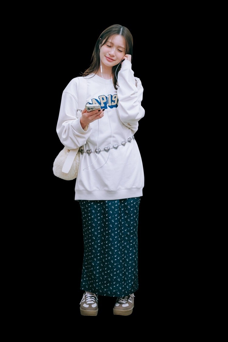 ちょうどいいカジュアルさが男のコの庇護欲をかきたてる♡ ロングスカート&スニーカーで、決めすぎない自然体なスタイルが◎。