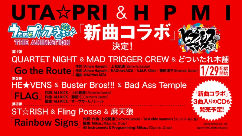 総勢18組の描きおろしタッグビジュアルが、「アニメ「うたの☆プリンスさまっ♪ マジLOVE」シリーズ」と「ヒプノシスマイク -Division Rap Battle-」の公式Xにて毎日公開される。続いて発表された「新曲コラボ」は、「うたの☆プリンスさまっ♪」と「ヒプノシスマイク -Division Rap Battle-」による完全新曲のコラボとなっており、第1弾、QUARTET NIGHT & MAD TRIGGER CREW & どついたれ本舗による「Go the Route」が1月29日午前0時より各種音楽配信サービスにてリリースされる。本楽曲は、作詞をAmon Hayashi/上松模康(Elements Garden)、作曲をAmon Hayashi/NAOtheLAIZA/A.M.P.killer/藤田淳平(Elements Garden)、編曲をNAOtheLAIZAが手掛ける。