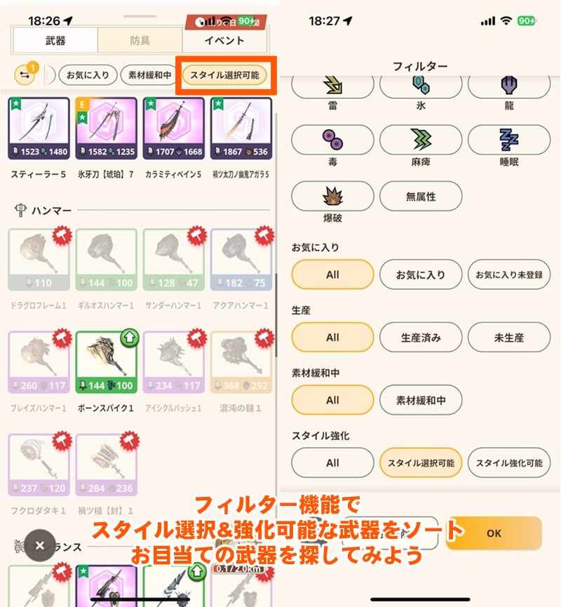 スタイル強化は以下の次元変異モンスター(ディアブロス、フルフル、レイギエナ、マガイマガド、イビルジョー、ラドバルキン、ドスギルオス、ボルボロス、トビカガチ、ジュラトドス、アンジャナフ、リオレイア、ベリオロス)の素材で生産、強化する武器のみが対象となってる。