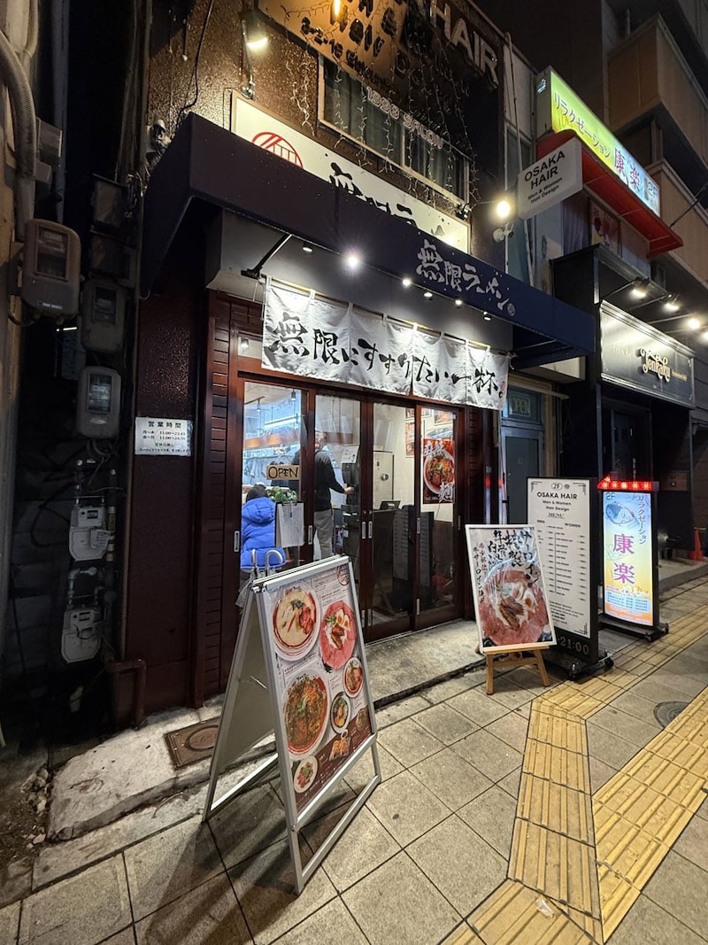 大阪に数店舗ある「無限ラーメン」。牛骨鶏白湯ラーメンが評判を呼び人気を博しているようである。