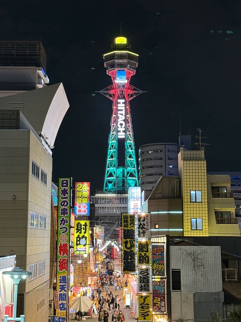 新今宮駅、動物園前駅からすぐの場所。近くには通天閣がそびえ立つ。