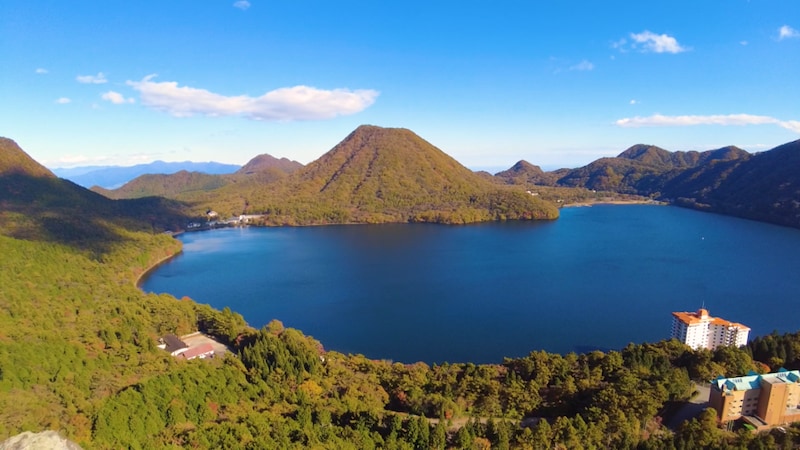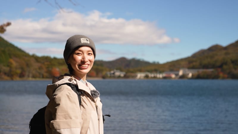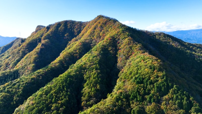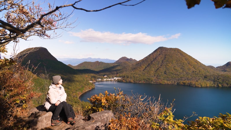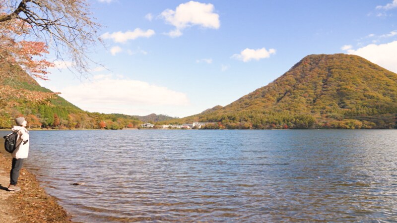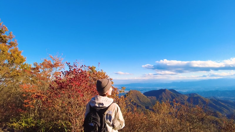 さあ、山頂まであと一息。登山道へ戻った戸田さん、傾斜のきつい登り道に息を切らせながらも紅葉の美しさに励まされてひたすら足を進めます。とうとう標高1,449mの掃部ヶ岳の山頂に辿り着きました。空と湖の鮮やかな青色に対して、紅葉に染まった周囲の山の赤色や黄色が鮮やかなコントラストを生み出しています。それはまさに、この季節に山に登った人にしかしか見ることができないご褒美でした。