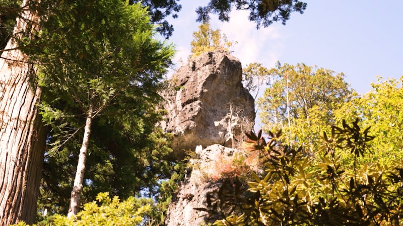 今回の出発地点は榛名神社。最寄りのバス停から参道へと進み、15分ほど歩くと緑に囲まれた境内に入ります。その先の頭上に聳えるのは高さ80mの巨大な岩。神が宿るとされる「御姿岩(みすがたいわ)」で、この岩の内部に洞窟があり、そこに榛名神社の御神体が祀られているのだとか。ここでパワーを授かった戸田さん、さっそく登山口へと向かいます。
