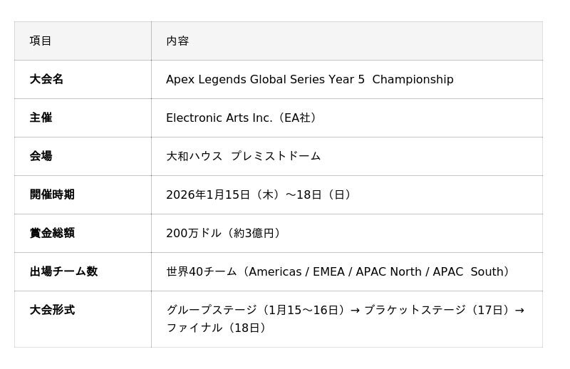 本イベントは、eスポーツ「Apex Legends」の年間王者を決める世界最高峰の公式大会で、2026年1月15日から18日にかけて札幌・大和ハウス プレミストドームで開催されます。