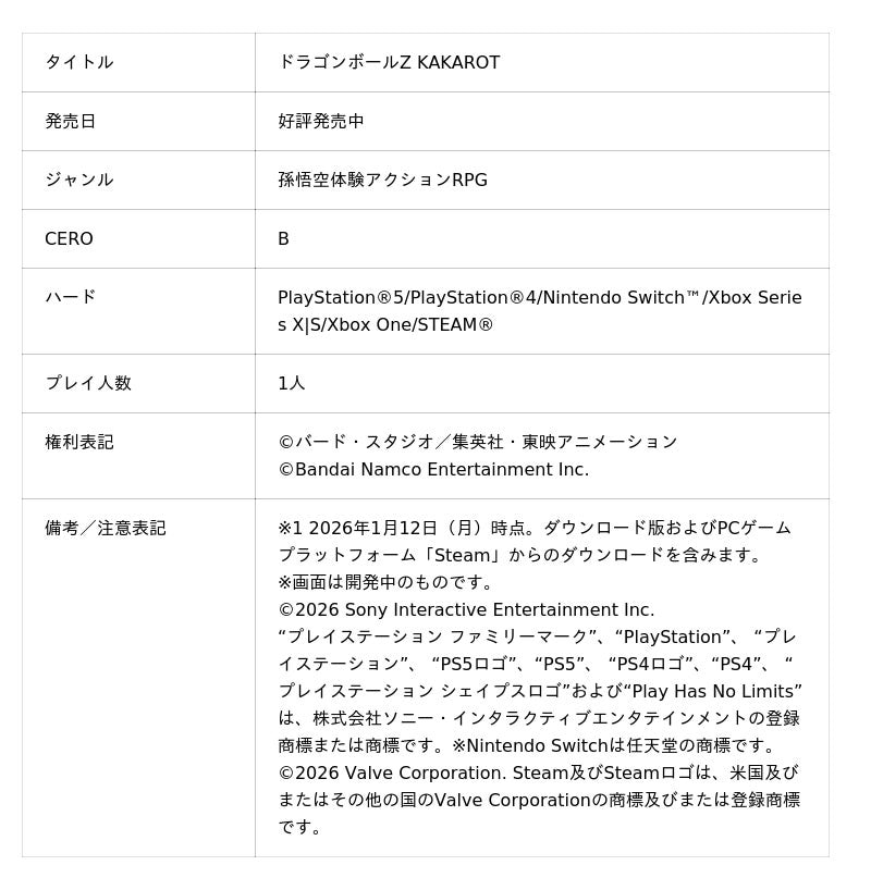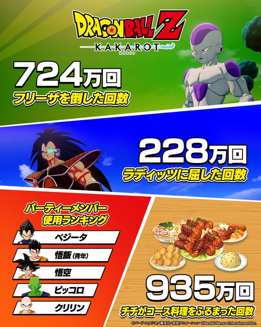 株式会社バンダイナムコエンターテインメントは、PlayStation(R)5/PlayStation(R)4/Nintendo Switch(TM)/Xbox Series X|S/Xbox One/STEAM(R)にて好評発売中の『ドラゴンボールZ KAKAROT』につきまして、世界累計販売本数が1,000万本突破(※1)したことをお知らせいたします。