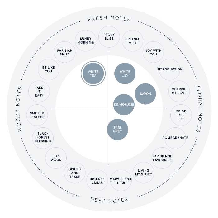 ホワイトティーの爽やかなシトラス調に、やさしく深みのあるティーの香りが重なり、心を穏やかに整えてくれる仕上がりに。