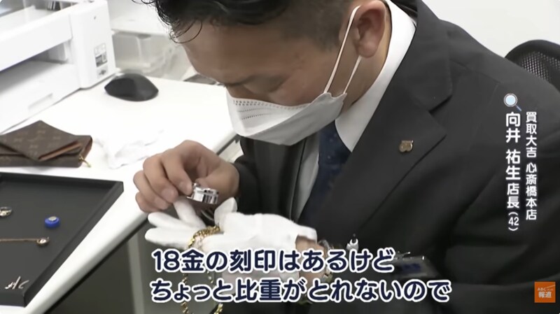 査定するのは店長さん。器具を使って細かいところまで調べると、1本のネックレスに金が75%含まれていることを示す「K18(18金)」の刻印を発見。結局、金色のアクセサリーはすべて金製品だとわかり、価格はなんと総額42万円に。希望の7倍という高値に「ハハハ、ちょっと信じらんない」と女性は笑いが止まりません。