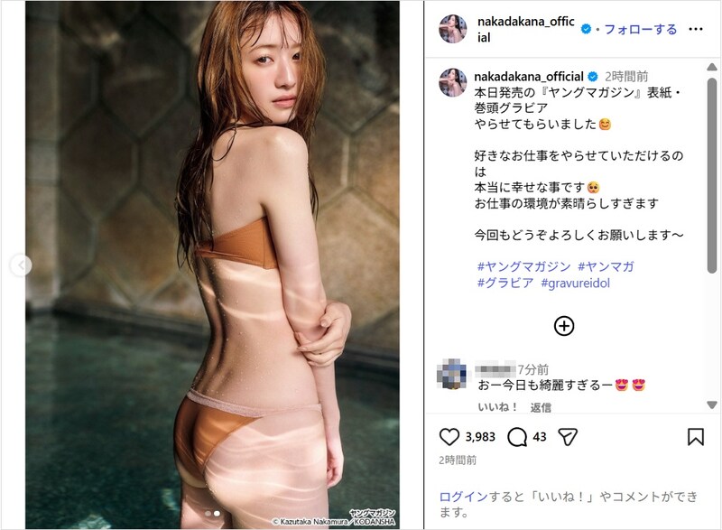 中田は「本日発売の『ヤングマガジン』表紙・巻頭グラビアやらせてもらいました」と報告し、水着姿のグラビアを投稿。カラフルなビキニで満面の笑みを見せる表紙カットや、振り向きショットで美ヒップを披露し、「好きなお仕事をやらせていただけるのは本当に幸せな事です お仕事の環境が素晴らしすぎます 今回もどうぞよろしくお願いします〜」と呼びかけた。