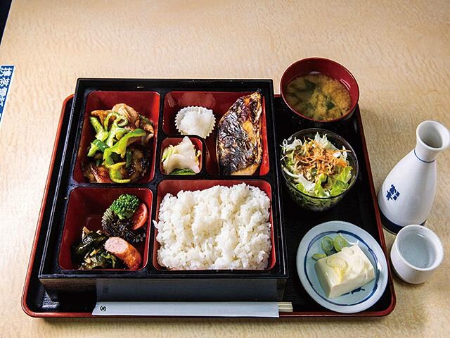 サワラの西京焼き定食(930円)をチョイス。総菜は豚肉とピーマン炒め、ウインナー、ひじき、酢の物など。どれも酒が進む。