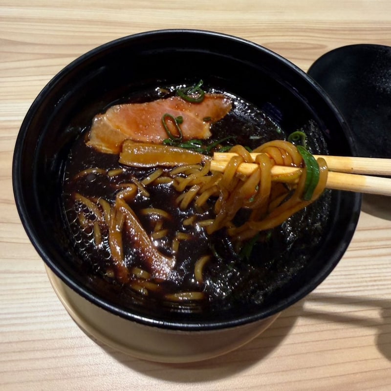 真っ黒なスープは醤油と出汁の旨味がたっぷり、黒胡椒でパンチの効いた一品となっている。