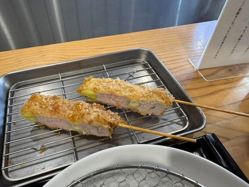 ネギ入りのヒレ串カツ。ホクホクのネギと美味しいヒレ肉、食べごたえあり。