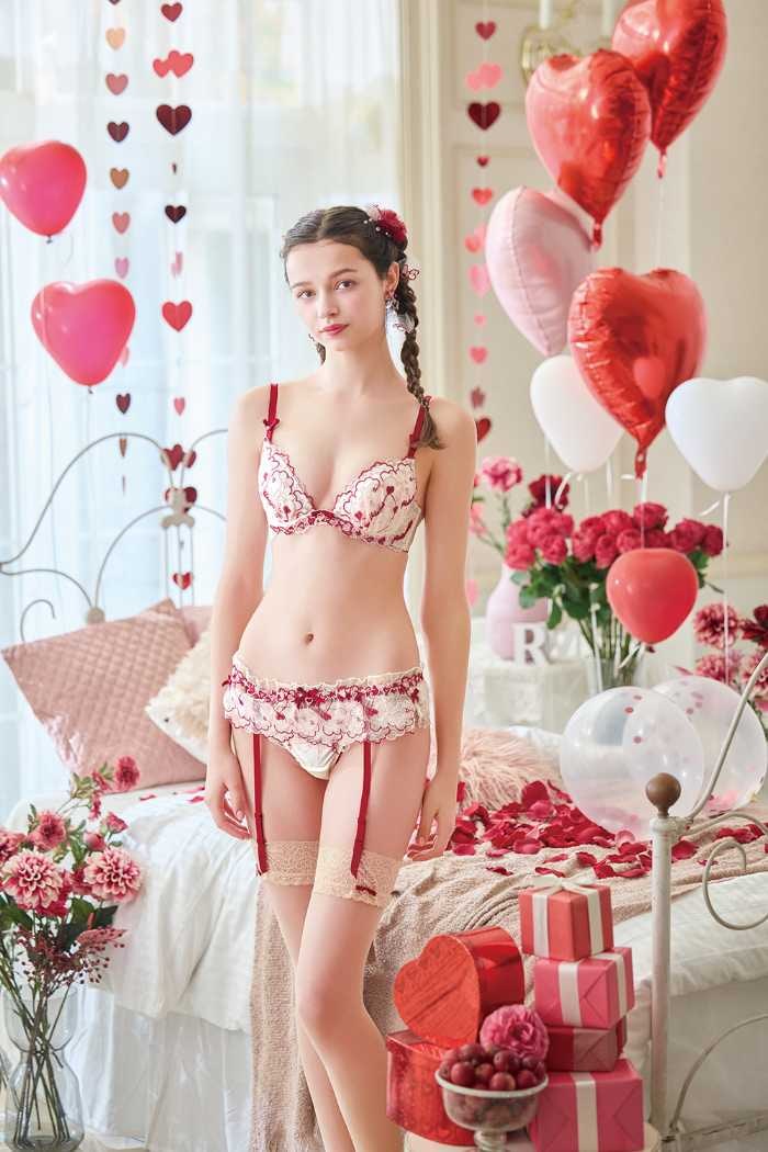 ヘルティーでは、カップ付きスリップ税込7,370円をはじめ、バレンタインコレクション初登場となるガーターベルト税込3,850円、ガーターストッキング税込2,530円など、特別感あふれるアイテムが揃います。
