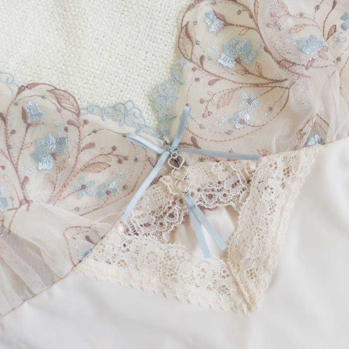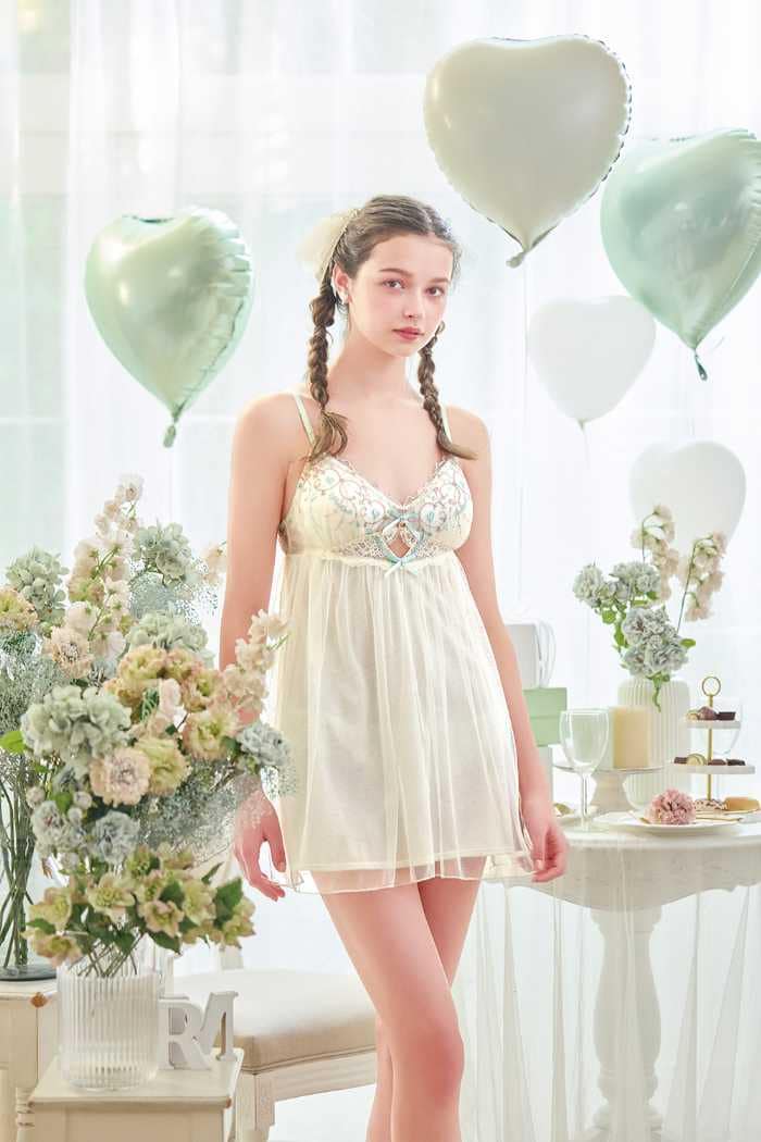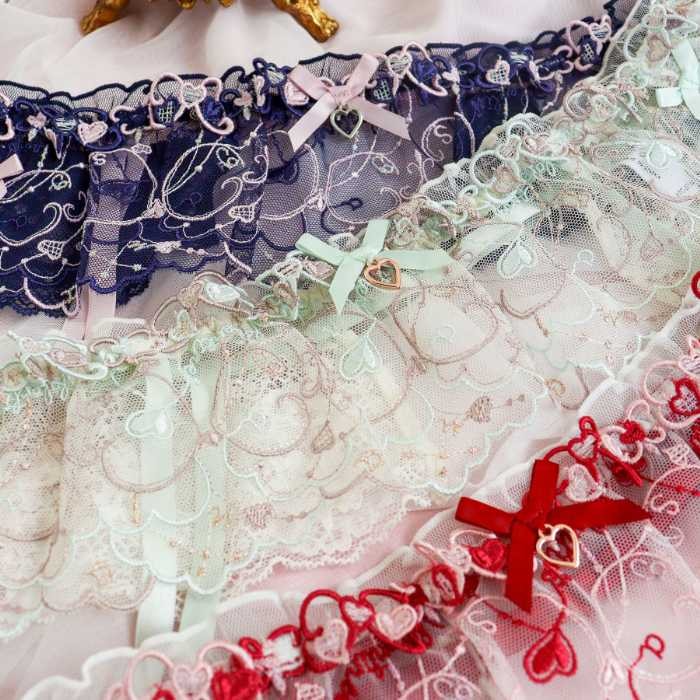ヘルティーはRibbonHeartJewel(リボンハートジュエル)をテーマに、立体的なハート刺繍やRisaMagliの文字を散りばめたレース、ゴールドチャームが華やかな印象を演出します。