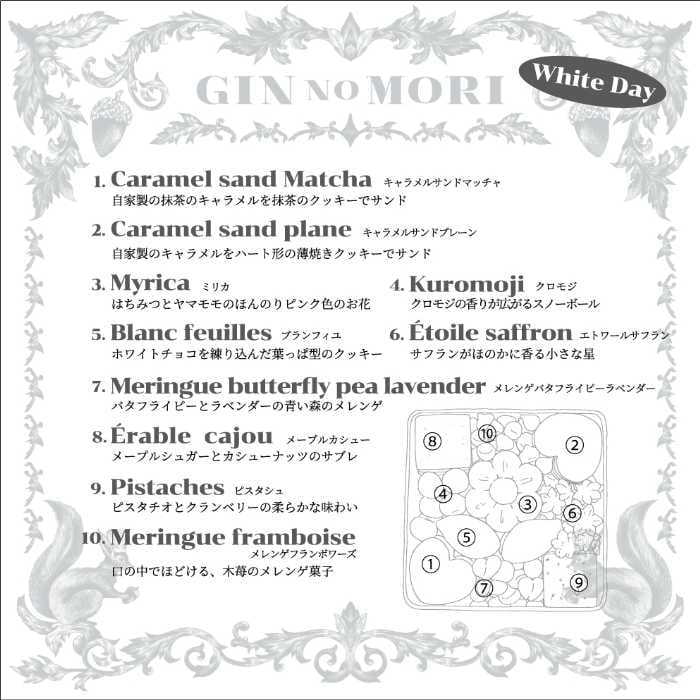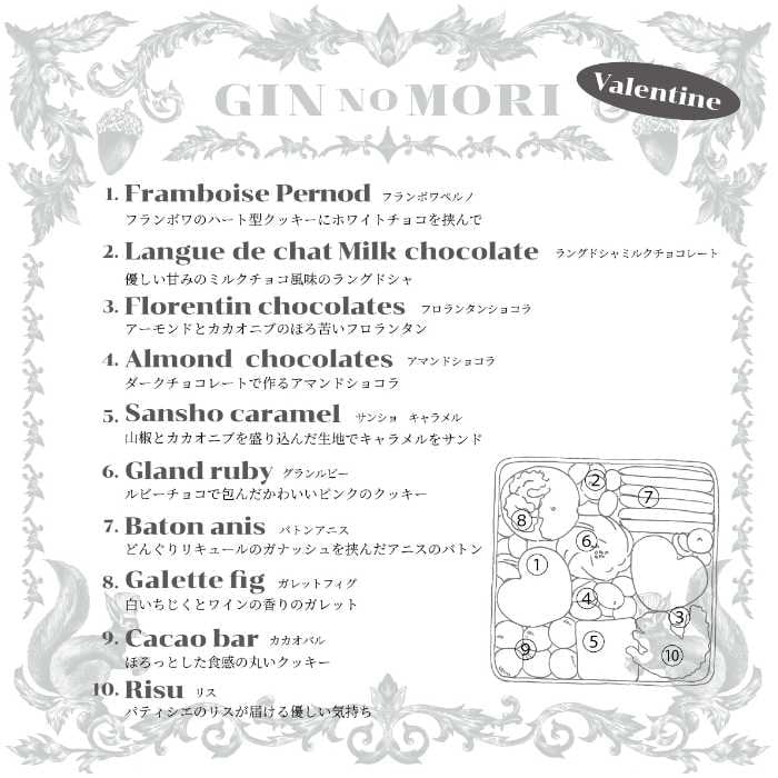 森の素材とショコラを贅沢に使った10種類のクッキーを詰め合わせ、ハート型やリス型など、愛らしさと上品さを兼ね備えた仕上がりです。
