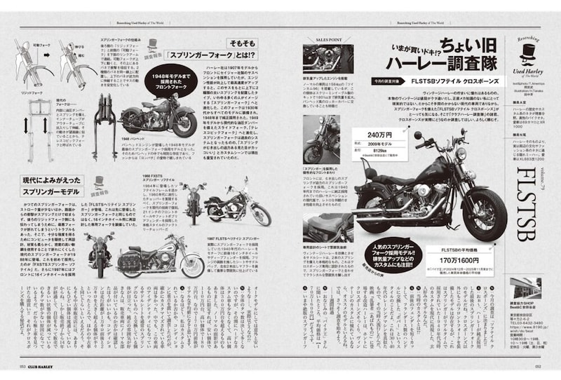 毎月1モデルをピックアップして現在の中古相場はもちろん、新車販売期間中に行われた仕様変更などを詳細に紹介する長期連載企画が「ちょい旧ハーレー調査隊」です。今月は、ノスタルジックな「スプリンガーフォーク」を備えた「FLSTSBソフテイル クロスボーンズ」を調査しました。ハーレーの中でもヴィンテージ風の車両を探している方は必見!!