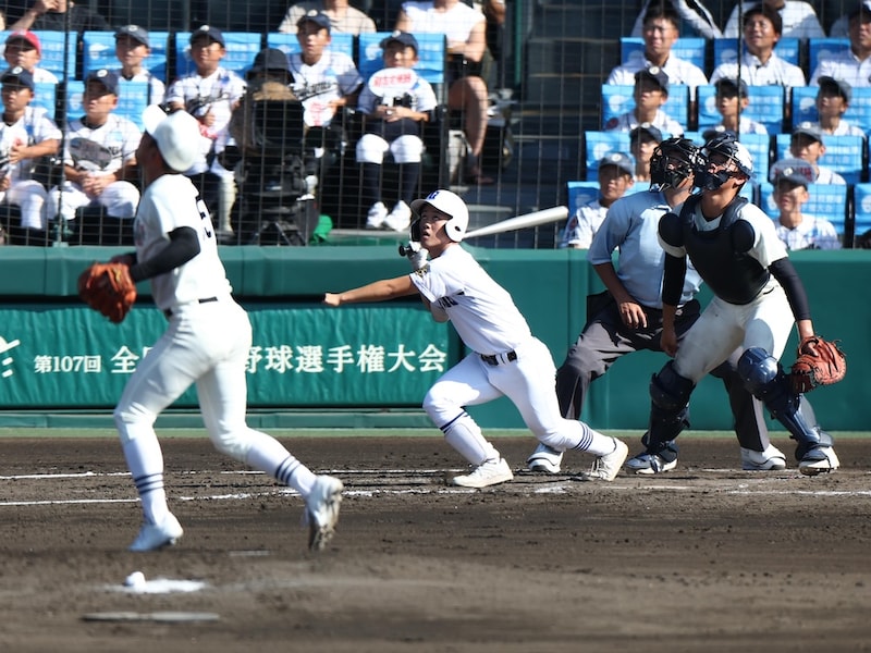 2025年夏の甲子園準決勝で、日大三(日本大学第三高等学校)から2回裏に犠飛を放つ横山選手。伊藤進之介撮影。画像提供:朝日新聞