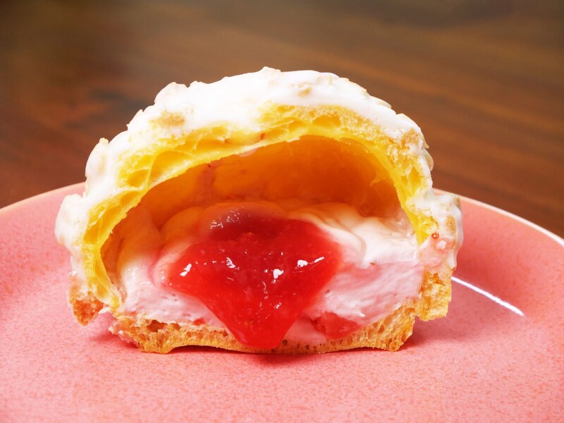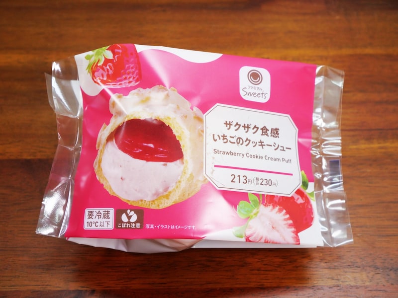 ファミマからの紹介コメント「ザクザク食感のクッキーシューにいちご果肉入りのいちごクリームといちごソースを入れました。※数量限定」