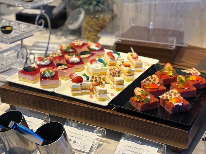 ビュッフェカウンターに並ぶ種類豊富な苺スイーツは、どちらも手に取りやすいサイズ感なので、お皿に盛り付けてゆくのも楽しい。
