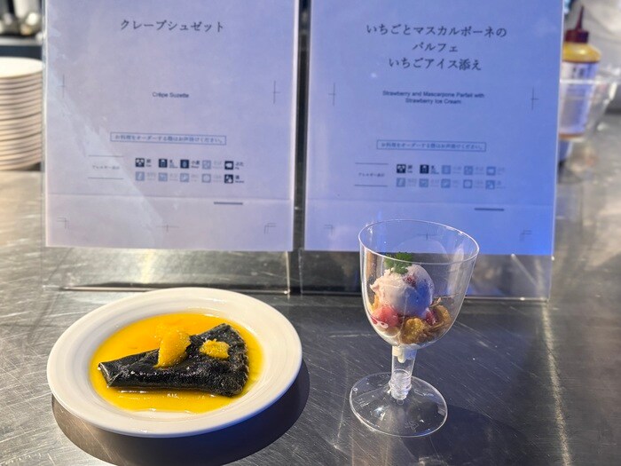 ライブ感満載!出来たてのスイーツがいただける「ライブクッキング」では、甘酸っぱい苺とクリーミーな味わいの「いちごとマスカルポーネのパルフェ いちごアイス添え」や「クレープシュゼット」をご用意。