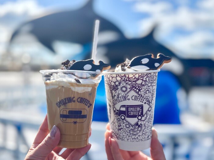 「オルカフェ限定カフェチョコ」オシャレなカップに入ったカフェチョコには、シャチのクッキーをトッピング。ふわふわのホイップを溶かしながらいただく、甘いドリンクです。
