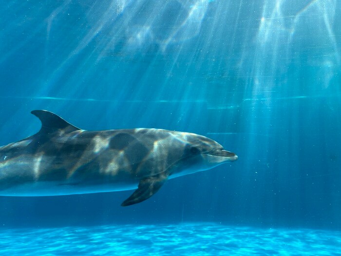 ゆったりとした時間が流れる、ドルフィンホール、イルカを眺めていると、時間が経つのも忘れてしまいそうな癒しの空間。