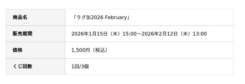 2026年1月15日(木)15:00より、「ラグ缶2026 February」の販売を開始いたします!