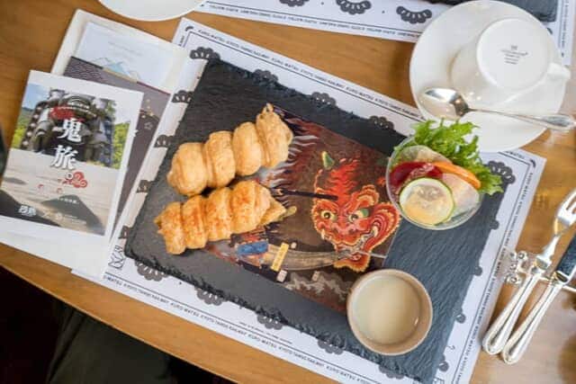 福知山駅から天橋立駅へと向かうモーニングコースは、「~大江山鬼退治伝説の地を味わう~」がテーマ。平安時代の鬼の頭領・酒呑童子(しゅてんどうじ)を退治する『大江山鬼退治伝説』の地を、食事を楽しみながら訪ねる約1時間40分の列車旅。福知山駅を10時8分に出発、天橋立駅に11時48分着で、1人¥7,000と気軽に楽しめるレストラン列車です。