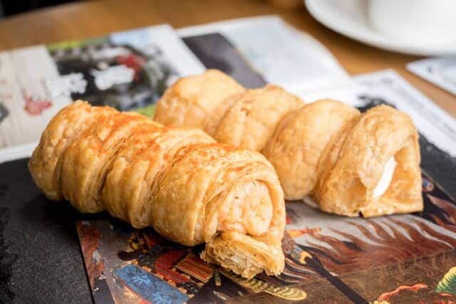 鬼のこん棒に見立てたパイコルネは、赤色がスモークサーモンとポテト、チーズのペーストを詰めた一品と、ロースハムと玉ねぎのムースの2種類。どちらも中身がたっぷり入ってボリュームも十分です。