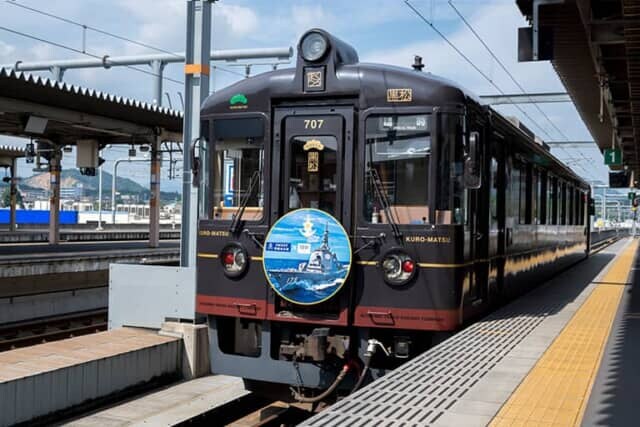 レストラン列車として使われる車両は、KTR700形を元に、新幹線や豪華寝台列車「ななつ星 in 九州」、観光列車「或る列車」などを手がけた水戸岡鋭治氏のデザインでリニューアル。黒ボディに金色のストライプや文字が入る上質な雰囲気です。今回は午後の「海上自衛隊 舞鶴地方隊コラボコース」があることから、スペシャル・ヘッドマークを装着。一方は護衛艦「みょうこう」、もう一方は2羽の鶴が向き合う舞鶴地方隊のマークです。