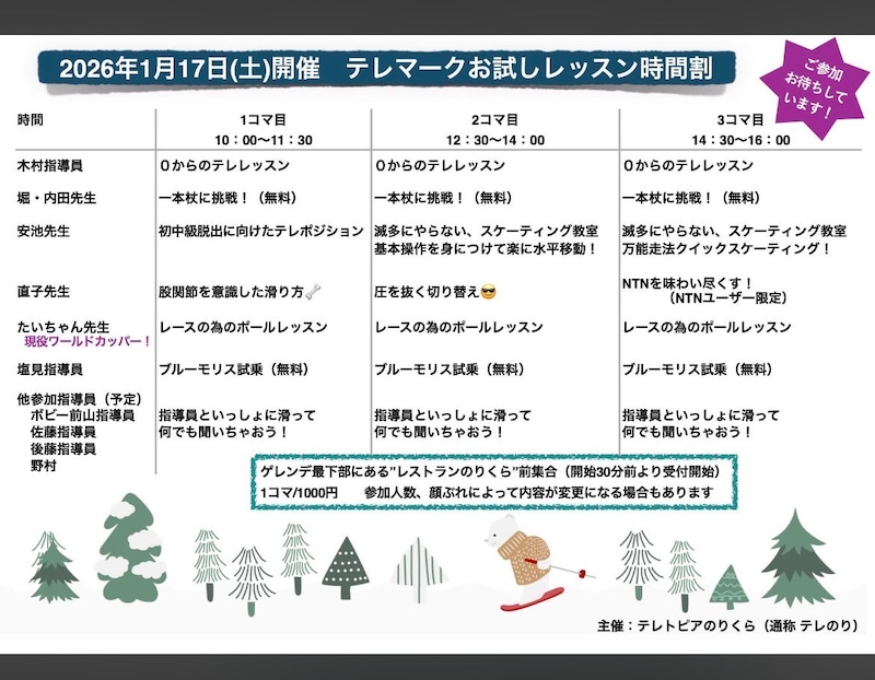 初日となる17日(土)は、毎年恒例の「テレマークお試しレッスン」を実施。経験豊富な講師陣による多彩なレッスンが用意されており、テレマーク初心者から経験者まで、それぞれのレベルや目的に合わせて参加できる内容となっている。