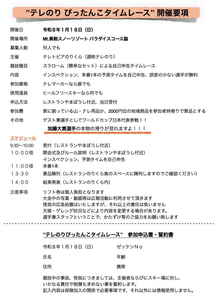 2日目の18日(日)には、毎年大好評の「ぴったんこタイムレース」を開催。テレマーカーであれば誰でも参加可能で、自己申告した予測タイムと実際の滑走タイムとの差が最も少ない参加者が勝利するというユニークなレースだ。
